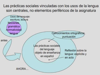 Este documento resume las prácticas sociales del lenguaje, el propósito de la enseñanza del español y los ámbitos de estudio. El objetivo principal de la enseñanza del español es desarrollar las competencias comunicativas y de lectura para que los estudiantes puedan expresarse, dialogar, formar juicios críticos y compartir conocimiento. La escuela busca aplicar estas prácticas del lenguaje en la vida cotidiana a través de la literatura, la participación social y la preparación de exposiciones.
