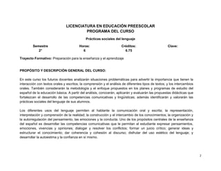 Este documento presenta el plan de estudios del curso "Prácticas sociales del lenguaje" para la Licenciatura en Educación Preescolar. El curso analiza las situaciones problemáticas relacionadas con el lenguaje y las interacciones orales y escritas, así como la metodología y enfoque de los planes de estudio de español para educación básica. Los estudiantes aprenderán a reconocer, aplicar y evaluar propuestas didácticas para fortalecer las competencias comunicativas y lingüísticas de los alumn