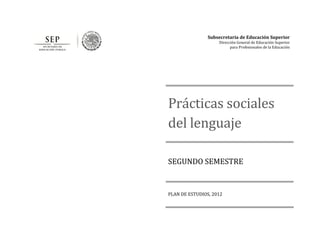 Este documento presenta el plan de estudios de un curso llamado "Prácticas sociales del lenguaje" para la Licenciatura en Educación Primaria. El curso se divide en tres unidades y se enfoca en analizar cómo se usa el lenguaje en diferentes contextos sociales y cómo desarrollar estrategias didácticas efectivas para fortalecer las habilidades comunicativas de los estudiantes. El curso ayudará a los futuros maestros a comprender mejor las necesidades lingüísticas de sus alumnos y a diseñar lecciones y proyect