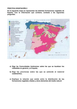 Este documento contiene cinco prácticas sobre vegetación en España que incluyen preguntas sobre la distribución de especies vegetales como el alcornoque y la encina, formaciones vegetales como robledales y matorrales, y espacios protegidos. Las prácticas requieren que se identifiquen provincias y comunidades autónomas, y se expliquen las relaciones entre la vegetación y factores naturales, así como los usos económicos de diferentes especies.