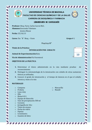 La práctica tuvo como objetivo determinar el grado de intoxicación del estaño en ratas mediante pruebas de reconocimiento. Se administró estaño a una rata por vía parenteral y se observó la sintomatología y tiempo de muerte, que fue de 3 minutos. Luego se extrajeron los órganos y se realizaron destilaciones y reacciones para identificar el estaño como causante de la intoxicación.