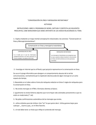 El documento presenta información sobre varios temas relacionados con la educación en línea y la comunicación digital, incluyendo la definición de netiqueta, conversación en línea, mensajería instantánea, grupos y foros de discusión, y educación en línea. Se proporcionan detalles sobre las características y ventajas de estos servicios, así como instrucciones y preguntas para actividades relacionadas con cada tema.