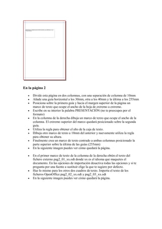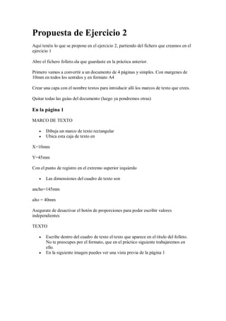 Este documento propone un ejercicio para maquetar un folleto de 4 páginas en InDesign. Instruye al lector sobre cómo agregar marcos de texto en cada página, dividir páginas en columnas, importar texto desde archivos externos, y posicionar elementos usando guías y la regla. El objetivo es practicar habilidades básicas de diseño de páginas y maquetación de documentos en InDesign.