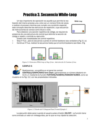 El documento explica el concepto de estructuras de repetición en programación, destacando dos modalidades de control: 'stop if true' y 'continue if true'. Además, se presenta un ejemplo práctico de cómo implementar un ciclo para graficar números aleatorios y simular el llenado de un tanque en un panel de control. Se menciona la importancia de incluir un retardo en la ejecución para permitir la observación de los datos recolectados.
