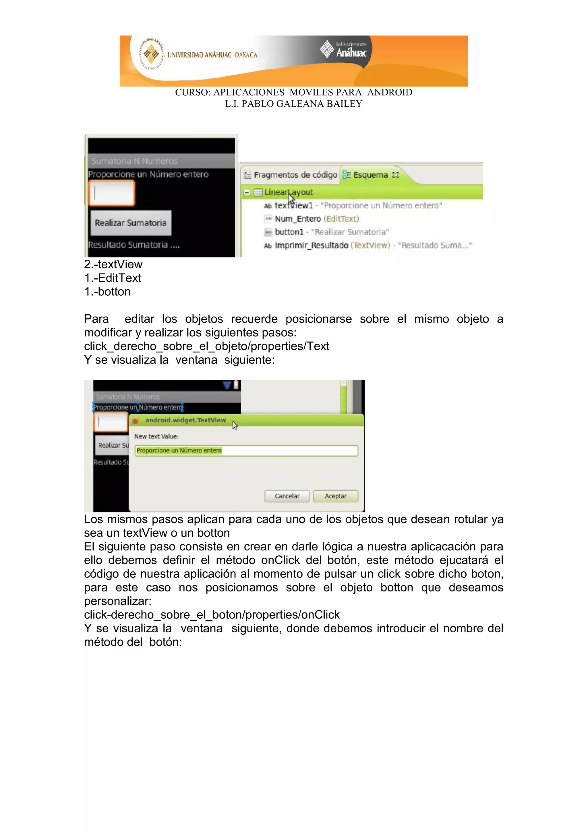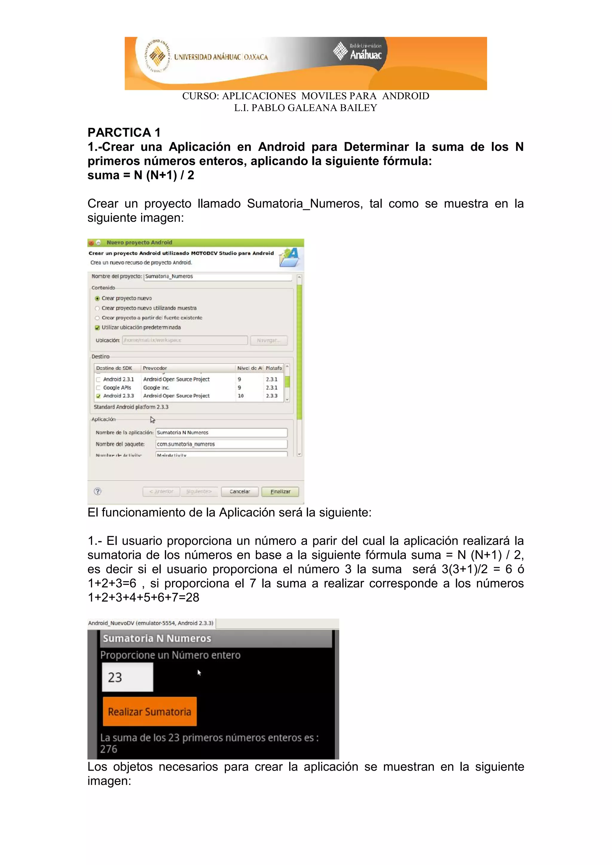 El documento describe tres prácticas para crear aplicaciones móviles en Android. La primera práctica explica cómo crear una aplicación que calcula la suma de los primeros N números enteros usando una fórmula. La segunda práctica explica cómo crear una aplicación que calcula el interés compuesto dado el capital, la tasa y el número de períodos. La tercera práctica explica cómo crear una aplicación que convierte una cantidad decimal que representa horas en horas, minutos, segundos y décimas de segundo.