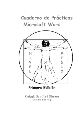 Este documento presenta un cuaderno de prácticas de Microsoft Word de nivel medio. Incluye 18 prácticas divididas en 6 temas sobre conceptos básicos, tablas, herramientas de Word, opciones de párrafo, hojas de cálculo y gráficos, e hipervínculos. El documento proporciona instrucciones detalladas para cada práctica y ejercicios para que los estudiantes practiquen y apliquen los conceptos cubiertos.