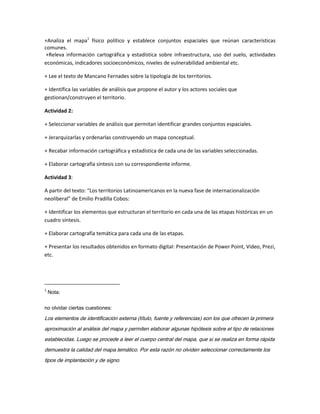 Este documento presenta un resumen de las actividades del Práctico 2 sobre los procesos y dinámicas de formación del territorio en América Latina. Se basa en las teorías de los territorios fijos y fluidos de Milton Santos y la tipología de territorios de Bernardo Mancano Fernandes. El objetivo es identificar elementos y relaciones espaciales en América Latina a través de la selección, jerarquización e interrelación de múltiples variables usando mapas temáticos.