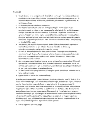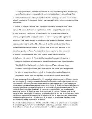 Google Chrome es un navegador web gratuito desarrollado por Google con componentes de código abierto como WebKit. Picasa es un programa de Google que permite organizar y editar fotos, y crear álbumes web para compartir imágenes en línea. Google Arts & Culture es una colaboración entre Google y museos que permite explorar de forma virtual más de 30,000 obras de arte de 150 colecciones de 40 países.