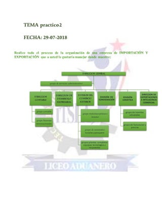 El documento proporciona una estructura organizativa con diferentes direcciones y divisiones, incluyendo Dirección General, Dirección Contable, Dirección de Desarrollo Empresarial, División del Comercio Exterior, División de Consignación, División Logística y Dirección de Exportaciones e Inteligencia Comercial. Cada una de estas secciones está dividida en grupos funcionales específicos. El documento también describe los pasos para analizar ofertas recibidas como buscar precios anteriores, cotizaciones, homologar precios y analizar factibilidad financ