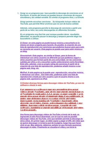 Songr es un programa para descargar canciones de varias calidades de manera simultánea, similar a Ares o Emule. Permite buscar canciones por letra y descargar en diferentes formatos. Goear y Grooveshark permiten escuchar música en línea, crear listas de reproducción y compartirlas en blogs. MixPod también permite compartir listas de reproducción en páginas web y iPod. Existen softwares como YouTube Downloader y sitios web como Force Download que permiten descargar videos de YouTube en diferentes formatos.