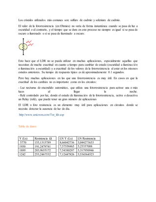 El documento describe un experimento para analizar cómo varía la resistencia de un LDR (diodo fotorresistivo) en función de la intensidad de la luz. Se explica que la resistencia de un LDR disminuye a medida que aumenta la intensidad lumínica, siguiendo una función exponencial. El experimento midió la resistencia de un LDR bajo diferentes niveles de iluminación y los resultados mostraron que cuanto mayor era la intensidad lumínica, menor era la resistencia del LDR.