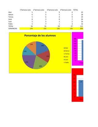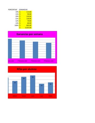 El documento presenta las ventas de fruta por tonelada, precio por tonelada, monto total y monto total con descuento para diferentes tipos de fruta exportadas a diferentes países. En total se exportaron 2828 toneladas por un monto de $624,400, con un monto total con descuento de $487,032. La fruta con mayor descuento fue la manzana con 41%, mientras que la sandia tuvo el menor descuento de 9%.