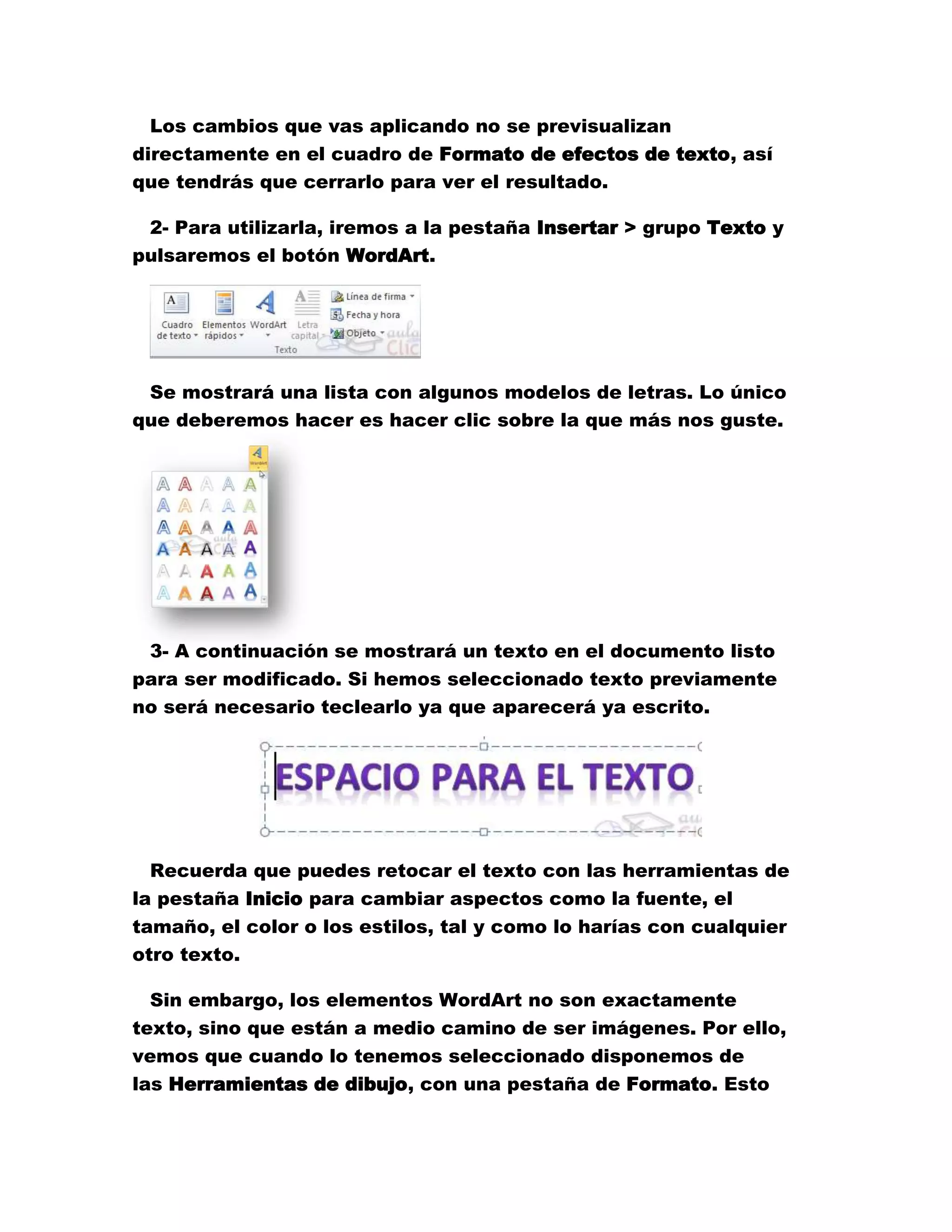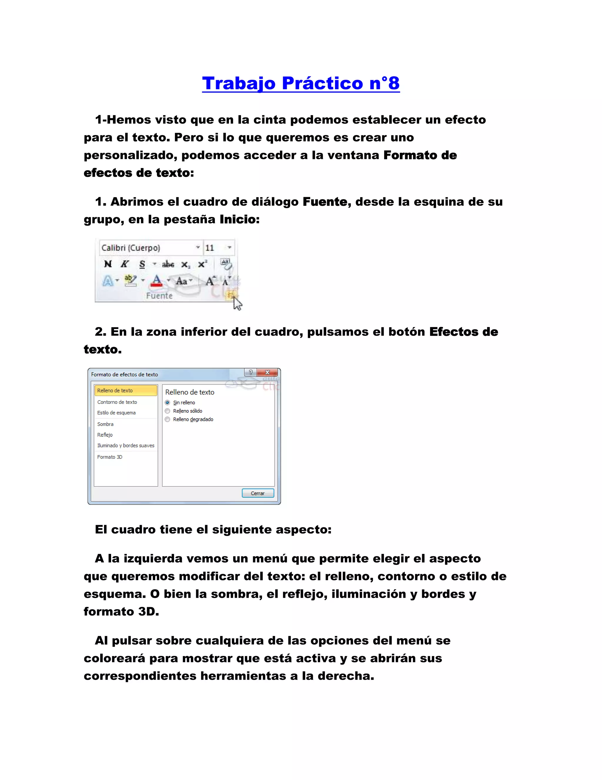 1) El documento explica cómo aplicar formatos de texto como efectos, estilos WordArt, alineación y sangría de párrafos, y cómo crear listas ordenadas en Microsoft Word.