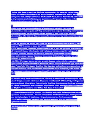 Este documento proporciona información sobre las unidades de medida de almacenamiento digital, las funciones de copia oculta y copia de carbón en correo electrónico, la definición de hipervínculo, las características y funcionalidades de SkyDrive de Microsoft como servicio de almacenamiento en la nube, y cómo crear, editar, compartir, descargar y renombrar archivos almacenados en SkyDrive. También explica cómo incrustar archivos de SkyDrive en páginas web y cómo Office Web Apps permite ver y editar documentos