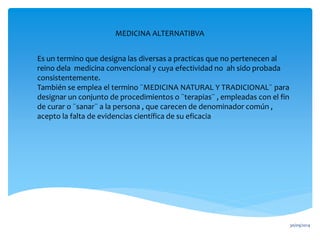 Este documento resume las medicinas alternativas y complementarias. Define la medicina alternativa como prácticas cuya efectividad no ha sido consistentemente probada y no pertenecen a la medicina convencional. También describe la medicina complementaria como terapias utilizadas junto con la medicina convencional para aliviar síntomas. Finalmente, clasifica las terapias complementarias y alternativas en cinco categorías como sistemas médicos alternativos, enfoques sobre la mente y el cuerpo, manipulación del cuerpo, medicinas naturales y otros.