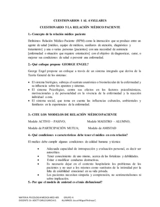 Este documento presenta un resumen de los cuestionarios 5 al 8 de la asignatura de Psicología Médica. Brevemente describe los siguientes temas: la relación médico-paciente y los modelos propuestos; la entrevista clínica, sus fases y factores que la influyen; el rol del paciente en la enfermedad y cuando busca ayuda; y conceptos sobre responsabilidad profesional médica como acto médico, impericia, imprudencia e inobservancia.