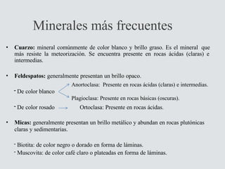 El documento proporciona una guía detallada sobre las rocas ígneas, sedimentarias y metamórficas, describiendo minerales frecuentes y clasificando diversos tipos de rocas según su formación y características. Se destacan diferentes texturas y componentes, así como la identificación de ejemplos específicos de cada categoría de roca. Además, se hacen aclaraciones sobre las diferencias entre rocas con características similares para ayudar en su identificación.