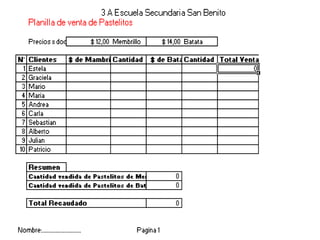 El documento proporciona instrucciones paso a paso para completar una planilla de cálculo en Excel sobre las ventas de pastelitos. Los pasos incluyen agregar encabezados, precios de productos, nombres de columnas, datos de clientes, fórmulas para calcular totales vendidos y el monto total facturado. El profesor enfatiza la importancia de trabajar en duplas y siguiendo las instrucciones para completar con éxito el ejercicio práctico.