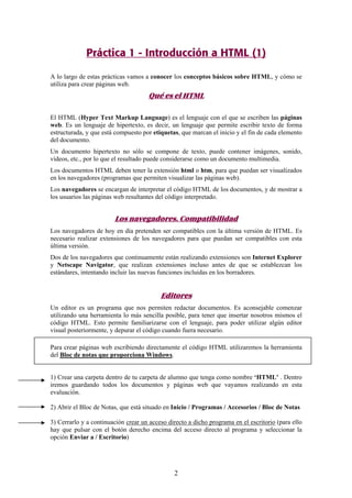 1) El documento presenta una introducción a HTML y proporciona instrucciones para crear páginas web básicas utilizando el Bloc de Notas de Windows. Se explican conceptos como etiquetas, estructura básica de una página, títulos, colores de fondo, comentarios y saltos de línea.