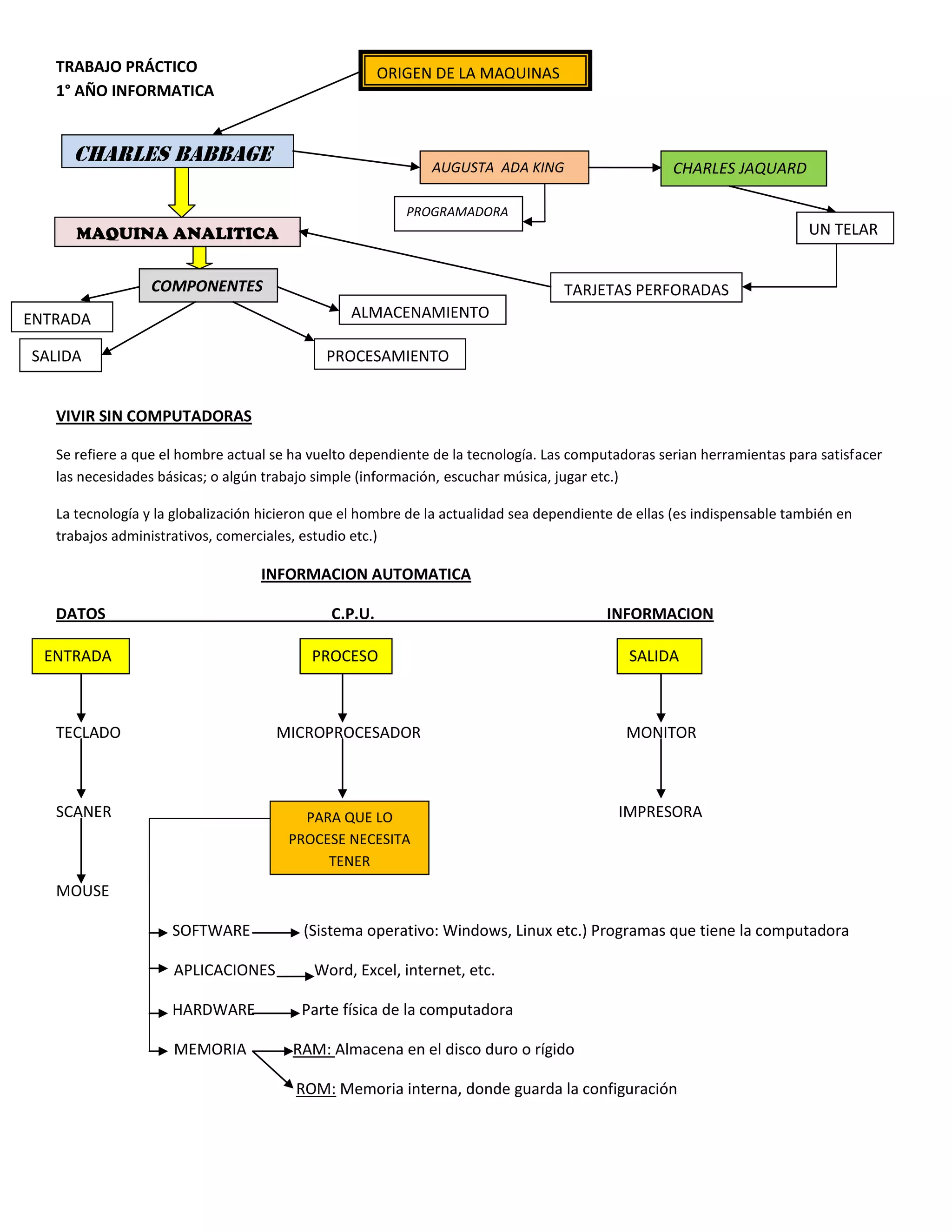 El documento habla sobre la dependencia que el hombre ha desarrollado hacia la tecnología y las computadoras. Explica que las computadoras son herramientas para satisfacer necesidades básicas e información, aunque también son indispensables para trabajos administrativos y de estudio. Describe luego los componentes básicos de una computadora como el procesador, memoria, entrada y salida de datos, y finalmente resume las cinco generaciones de computadoras, desde las primeras basadas en válvulas hasta las actuales de inteligencia artificial.