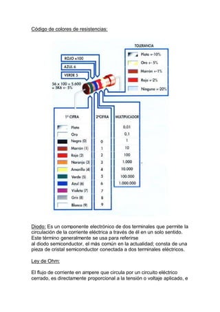 El documento describe un experimento para analizar la relación entre la tensión (V) y la corriente (I) en resistencias eléctricas y diodos. Muestra gráficos de V vs I para una resistencia de 470 ohmios, una resistencia de 100 ohmios y diodos 1N4007 y AA118, que demuestran relaciones lineales consistentes con la ley de Ohm. El objetivo es verificar experimentalmente la validez de la ley de Ohm para resistencias y el comportamiento unidireccional de la corriente en diodos.