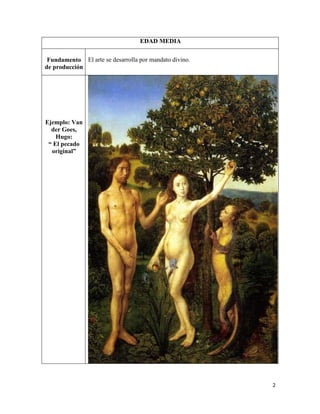 Este documento presenta un esquema con cuatro categorías (fundamento de producción, artista, comitente y fin) para analizar los principales cambios históricos en la estética desde la Edad Media hasta la Ilustración. Se pide ampliar este esquema explicando cada categoría y dando ejemplos visuales para cada período. También se piden definiciones de conceptos como percepto y su relación con el ojo crítico, y comparaciones entre obras del Renacimiento y vanguardia en relación al concepto de mundo/arte. Por último, se solic