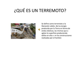 El documento resume los conceptos básicos sobre terremotos. Explica que un terremoto es la liberación súbita de energía producida por la Tierra en forma de ondas elásticas que agitan la superficie. También describe cómo se miden los terremotos usando las escalas de magnitud e intensidad y explica que la magnitud mide la energía liberada mientras la intensidad mide los daños causados. Finalmente, señala que aunque no se pueden predecir terremotos exactamente, la ciencia sísmica puede identificar las regiones propensas