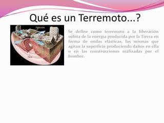 El documento resume varios aspectos clave sobre terremotos. Explica que un terremoto es la liberación súbita de energía producida por la Tierra en forma de ondas elásticas, y que ocurren debido a la colisión de placas tectónicas o la deformación de fallas. También indica que no es posible predecir con exactitud un terremoto, aunque es posible identificar regiones sísmicas y estimar la magnitud de futuros eventos basados en la historia geológica. El tamaño de un terremoto se