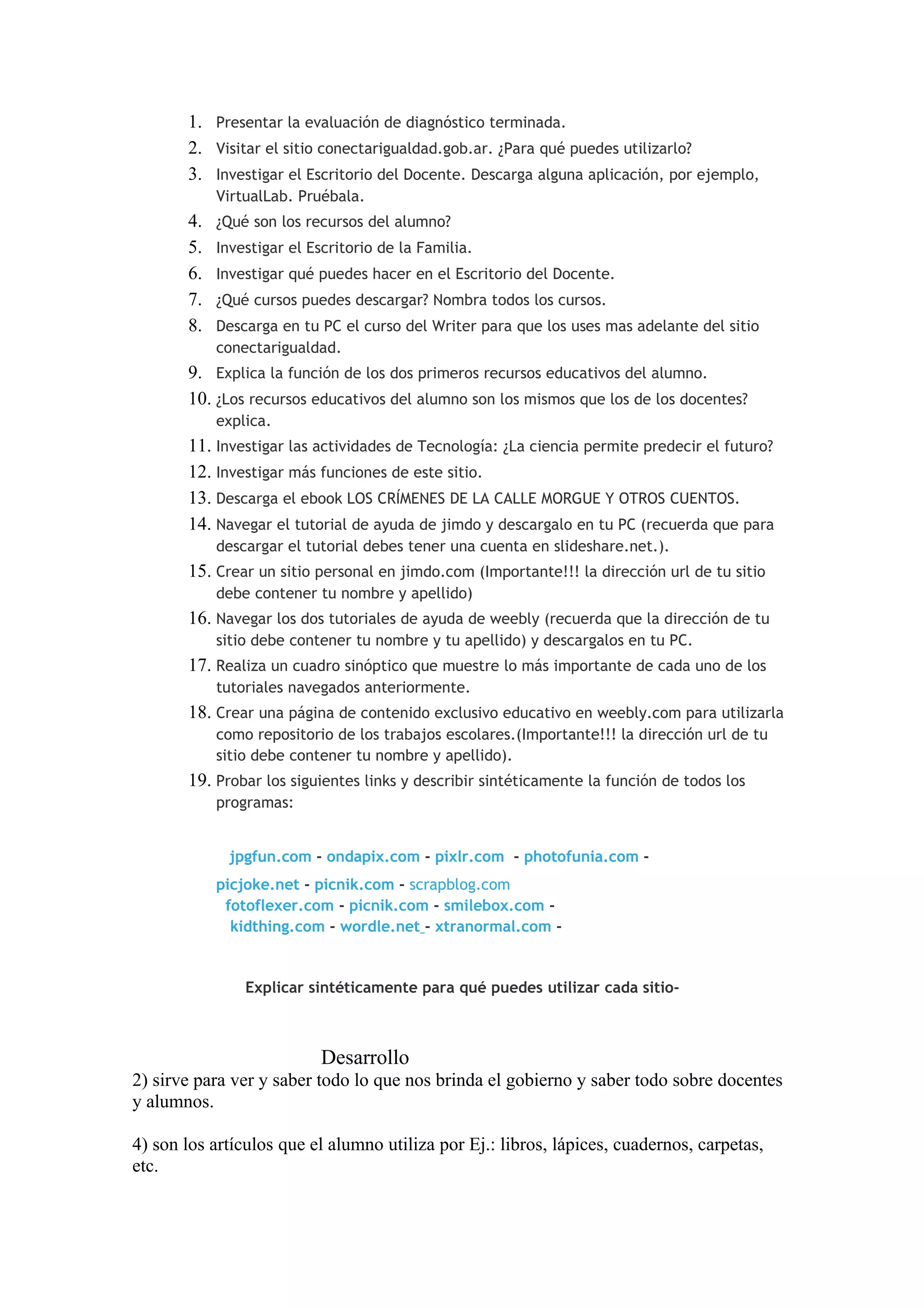 1. El documento instruye al lector a completar varias tareas relacionadas con el sitio web conectarigualdad.gob.ar, incluyendo descargar aplicaciones, investigar recursos para docentes y alumnos, y descargar cursos y tutoriales.