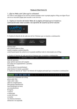 TRABAJO PRACTICO Nº2 1.¿Qué es Webs.com? ¿Para qué lo utilizaste? Un webs es una pagiga en la cual los usuarios pueden crear su propia pagina o blog con algun fin,en este no es necesario pagar para acceder a este servicio 2. Explica la función del botón Webs de la página principal que se muestra a contnuación:este voton accede a las opciones de usuario.ej:cerrar seccion 3. Explica la función de de cada uno de los 4 botones que se muestra a continuación: manage page: edit website:editar tu blog modify template:cambiar plantilla control panel:panel de control en el se puede modificar todo lo relacionado con el blog 4. Explica la función de cada uno de los 6 botones que se muestra a continuación: barra de opciones: page options:opciones de la pagina new page:nuva pagina(boton o pestaña) help:ayuda view:es mirar (vista preliminar) done:listo(es lo mismo q guardar) 5. Explica la función de "todos" los botones de la página principal que se muestran a continuación: content box:contenido de tu blog photo:subir foto video:subir video add-ons:complementos link:agregar hiperbinculo font:fuente(tipo de letra) size:tamaño(letra) B:negrita i:cursiva u:subrayado a:color del texto a:resaltar Ax:eliminar formatos aliniacion e la izquierda