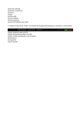 aliniacion centrada aliniacion ala derecha enumerar sangria incertar tabla incertar simbolo incertar emoticon incertar HTLM(direccion web) 6. Explica la función de "todos" los botones de la página principal que se muestran a continuación: change template:cargar plntilla change background:cambiar el fondo header y footer:encabesado y pie de pagina advanced css: save:guardar cancel:cancelar