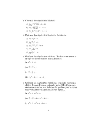 El documento presenta varios ejercicios de cálculo de límites y de integrales definidas. En el primer ejercicio se piden calcular límites de funciones. En el segundo, integrales definidas de funciones elementales. En el tercero, integrales definidas de funciones trigonométricas, exponenciales y logarítmicas.