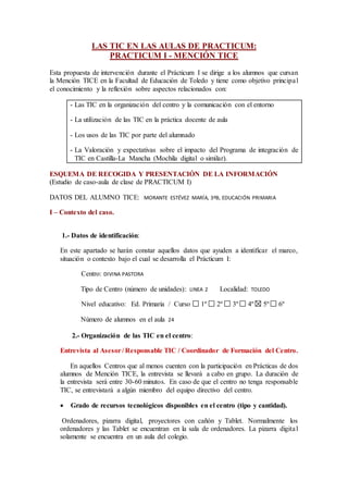 (1) El documento describe una propuesta para observar el uso de las TIC en las aulas de Prácticum I para estudiantes de la Mención TICE en la Facultad de Educación de Toledo. (2) La propuesta se centra en conocer aspectos como el uso de TIC en la organización escolar, la enseñanza, y las expectativas sobre programas TIC. (3) El documento incluye un esquema para recopilar información sobre un caso de estudio en un aula, incluyendo entrevistas y