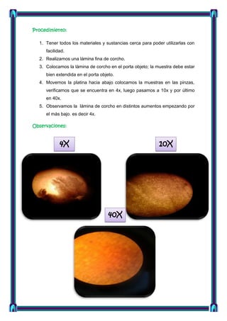 El documento describe una práctica de laboratorio para observar espermatozoides utilizando un microscopio. Se recolecta una muestra de semen y se coloca en un portaobjetos para observarla a diferentes aumentos, notando características como la cabeza, cuello y cola del espermatozoide. Se concluye que se pueden observar con mayor claridad a 40x.