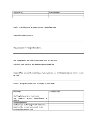 El documento presenta varias actividades de práctica sobre el uso de la gramática y ortografía en español. Incluye ejercicios para completar cuadros, corregir el uso de la B y V, usar conectores, clasificar oraciones y más. El objetivo es que los estudiantes practiquen y mejoren diferentes aspectos del lenguaje a través de estas actividades.