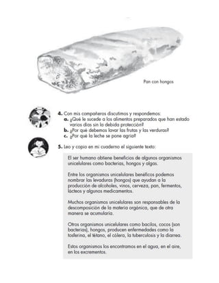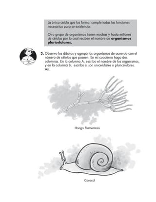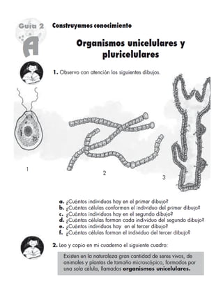 El documento proporciona instrucciones para una práctica sobre organismos unicelulares y pluricelulares. Los estudiantes deben hacer listas de estos organismos en la lectura "En el mar", y responder preguntas sobre las diatomeas y por qué Teresa revisa las branquias de los peces. También deben responder preguntas sobre las diferencias entre células en organismos pluricelulares versus unicelulares, y hacer listas de alimentos hechos con organismos unicelulares y enfermedades causadas por ellos.