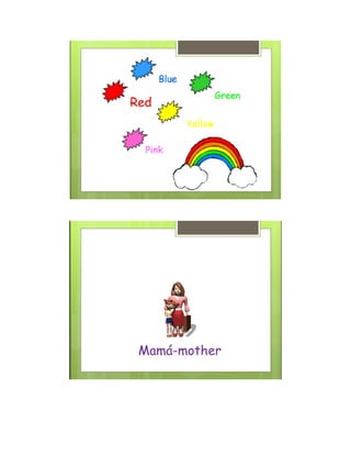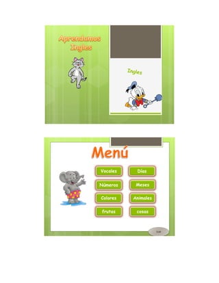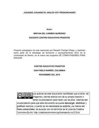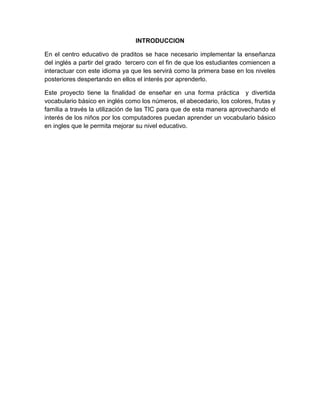 Este documento describe un proyecto para enseñar vocabulario básico de inglés a estudiantes de tercer grado en el centro educativo Praditos en Colombia a través de actividades lúdicas con computadores. El proyecto busca que los estudiantes aprendan números, el abecedario, colores, frutas y nombres de familia en inglés de una manera divertida y práctica para mejorar su nivel educativo.
