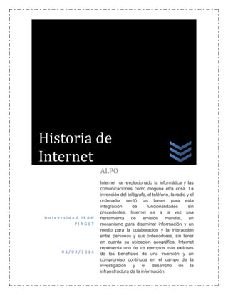 Internet ha revolucionado la información y comunicación como ninguna otra innovación. Se originó de las invenciones del telégrafo, teléfono, radio y computadora que sentaron las bases para integrar estas funcionalidades sin precedentes. Internet permite la transmisión mundial de información, la colaboración y la interacción entre personas sin importar su ubicación geográfica, representando uno de los ejemplos más exitosos de los beneficios de la investigación y desarrollo de infraestructura de información.