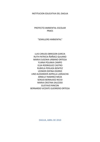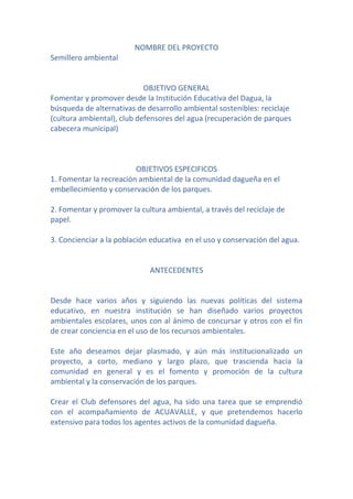 El proyecto "Semillero Ambiental" tiene como objetivo promover el desarrollo ambiental sostenible en la Institución Educativa del Dagua a través de actividades como el reciclaje, la conservación de parques y la educación sobre el agua. El proyecto se llevará a cabo en la institución educativa y la comunidad durante 2010-2011 con la participación de comités estudiantiles, docentes y entidades externas.