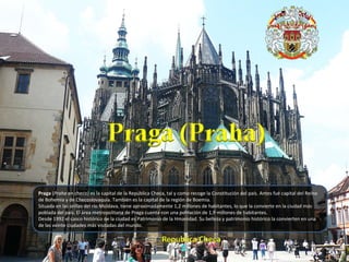 Praga es la capital de la República Checa y de la región de Bohemia, con una población de aproximadamente 1,2 millones de habitantes. Desde 1992, su casco histórico es patrimonio de la humanidad, lo que la convierte en una de las ciudades más visitadas del mundo. Anteriormente fue capital del reino de Bohemia y de Checoslovaquia.