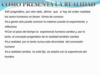 El pragmatismo es una escuela filosófica estadounidense fundada por Charles Sanders Peirce y William James a finales del siglo XIX. Reducen lo verdadero a lo útil y niegan el conocimiento teórico, afirmando que solo es verdadero aquello que conduce al éxito individual o se ha verificado con los hechos.