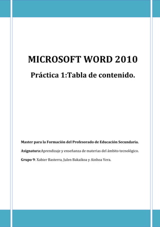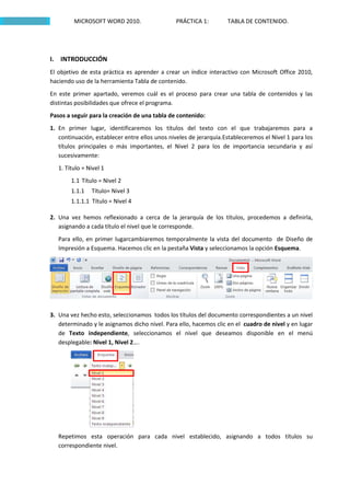 Este documento describe los pasos para crear una tabla de contenido en Microsoft Word 2010. Explica cómo asignar niveles jerárquicos a los títulos, insertar y personalizar la tabla de contenido, y actualizarla cuando se realizan cambios en el documento. También incluye un ejercicio para crear una tabla de contenido con características específicas para un texto dado.