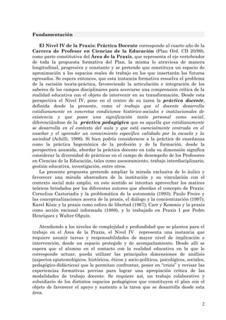 Este documento describe el programa de Práctica Docente del cuarto año de la carrera de Profesorado de Ciencias de la Educación en la Universidad Nacional de San Luis. El programa busca que los estudiantes desarrollen experiencia en la práctica docente real en escuelas secundarias y universidades, con el objetivo de integrar la teoría y la práctica. El programa incluye observaciones en aulas, seminarios de estudio, y prácticas de enseñanza supervisadas, con un enfoque en la reflexión crítica