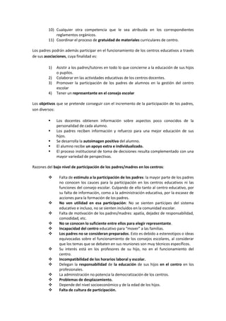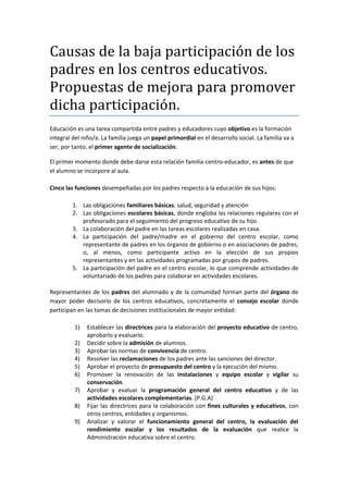 La participación de los padres en los centros educativos es importante pero actualmente los niveles son bajos. Hay varias razones para esto como falta de estímulo, motivación y conocimiento sobre cómo participar. Los centros y administraciones deben hacer más para promover la participación de los padres, la cual tiene muchos beneficios como mejorar la comunicación entre el hogar y la escuela y apoyar el aprendizaje y desarrollo del niño.