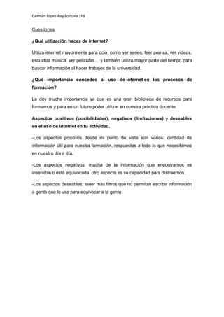 El documento presenta los resultados de una encuesta realizada en España en 2013 sobre el perfil del internauta español. Los principales hallazgos son que los hombres usan más Internet que las mujeres, especialmente entre los jóvenes y adultos más jóvenes. Dos tercios de los encuestados son hombres entre 25 y 44 años. El acceso más común es a través de dispositivos móviles. Los usuarios pasan al menos 2 horas diarias en Internet y lo usan a diario desde el móvil o tableta. El navegador y sistema operativo más popul