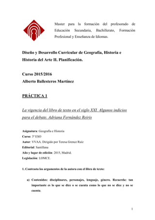 El resumen analiza un documento que critica un libro de texto de 3o de ESO de Geografía e Historia. Señala que el libro presenta contenidos simplistas, monotemáticos y tradicionales que no generan debate ni potencian la iniciativa del alumno. Además, enfatiza aspectos políticos sobre otros ámbitos y presenta una historia jerarquizada y sexista. Sin embargo, incluye algunas actividades que conectan con la realidad del estudiante. El documento concluye que el libro de texto es una herram