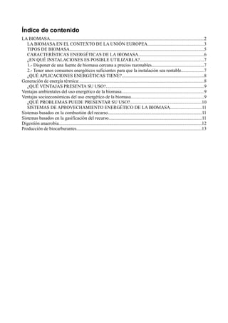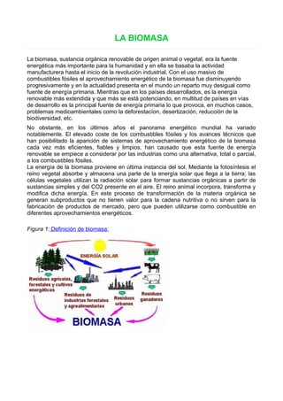 Este documento describe las características y aplicaciones de la biomasa como fuente de energía renovable. Explica que la biomasa incluye todo material orgánico de origen vegetal o animal y que su energía proviene de la radiación solar absorbida por las plantas. También describe los diferentes tipos de biomasa, sus características energéticas, las instalaciones donde puede ser utilizada y sus aplicaciones para generar energía térmica, eléctrica o mecánica a través de procesos como la combustión, gasificación o producción de biocarbur