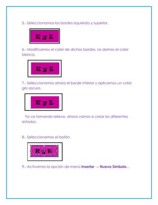 Este documento proporciona instrucciones para crear un botón con relieve en 16 pasos. Estos incluyen dibujar un rectángulo, cambiar el color de fondo y bordes para crear relieve, agregar texto, convertirlo en un símbolo de botón con diferentes estados al presionarlo (presionado, sobre, zona activa), y reproducir la animación.