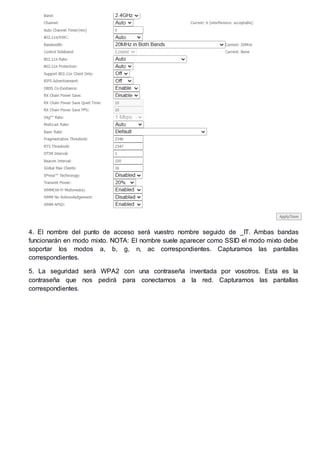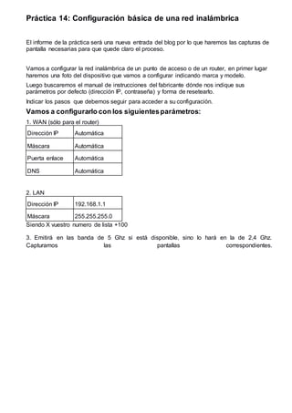 El documento describe los pasos para configurar una red inalámbrica, incluyendo establecer la dirección IP y máscara de red del punto de acceso, configurar el nombre de la red y la contraseña WPA2, agregar direcciones MAC a la lista permitida, y probar la conectividad desde un móvil y portátil.