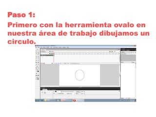 El documento proporciona 8 pasos para crear un botón animado en Adobe Animate usando el óvalo y la herramienta de texto. Estos pasos incluyen dibujar un círculo, cambiar su relleno, convertirlo en un símbolo de botón, editar los fotogramas para cambiar el fondo y texto en cada uno, e introducir texto dentro de la figura usando la herramienta de texto. Al final, presionar Ctrl + Enter o F12 para ver el efecto animado del botón creado.